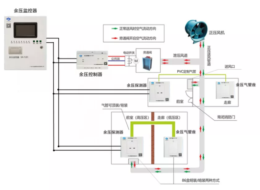 鑒于上述考慮,公安部消防科學研究所結合國際經驗提出余壓值的數據。壓差操控系統可通過操控旁通閥的開閉,將機械加壓送風系統的余壓值有用操控在國標要求的合理范圍內-----防煙樓梯間40-50Pa,前室、合用前室、消防電梯間前室、封閉避難層(間)為25-30Pa。這樣既阻撓了有害煙氣的進入,也確保了防火門在需求人員分散時能夠正常開閉。