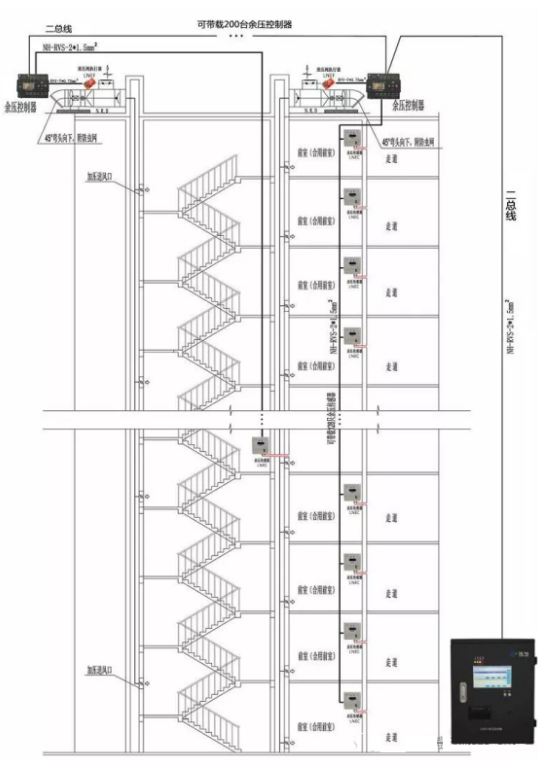 余壓監控系統由余壓監控主機、余壓操控器、余壓傳感器、泄壓閥執行器組成,余壓監控主機裝置于消防中控室內部可以對整個體系進行實時監控,經過二總線連接到余壓操控器,余壓操控器實時的讀取余壓傳感器的余壓值和報警值,然后經過泄壓執行器對 風機進行泄壓,余壓操控器可以不連接余壓監控主機直接形成小體系運用。余壓傳感器提供現場的余壓值和余壓報警。泄壓閥執行器執行來 自余壓監控器的操控信號操控是否泄壓。