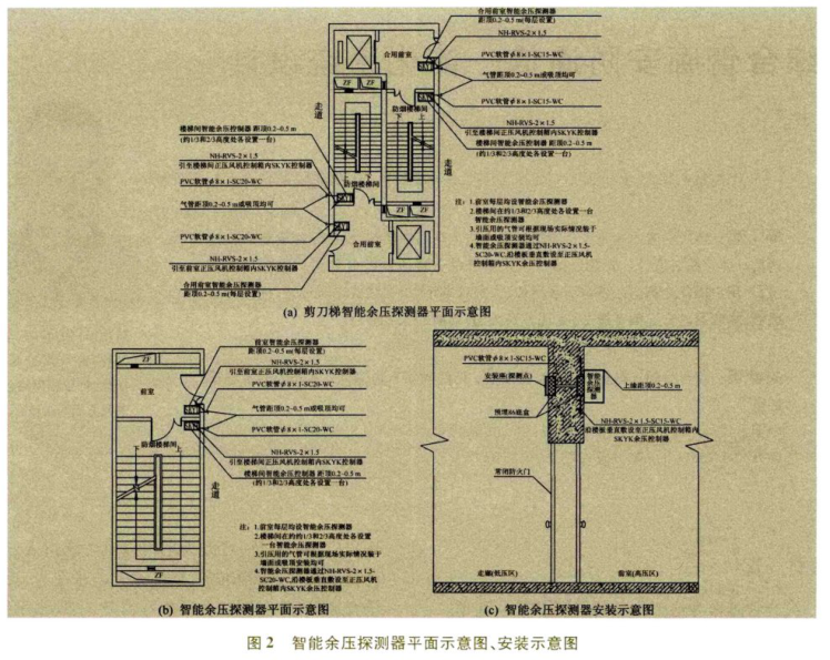 每臺加壓送風機配電控制箱內設置余壓控制器;防煙樓梯及其前室應設置余壓探測器;消防電梯間前室或合用前室應設置余壓探測器。3.3設置部位