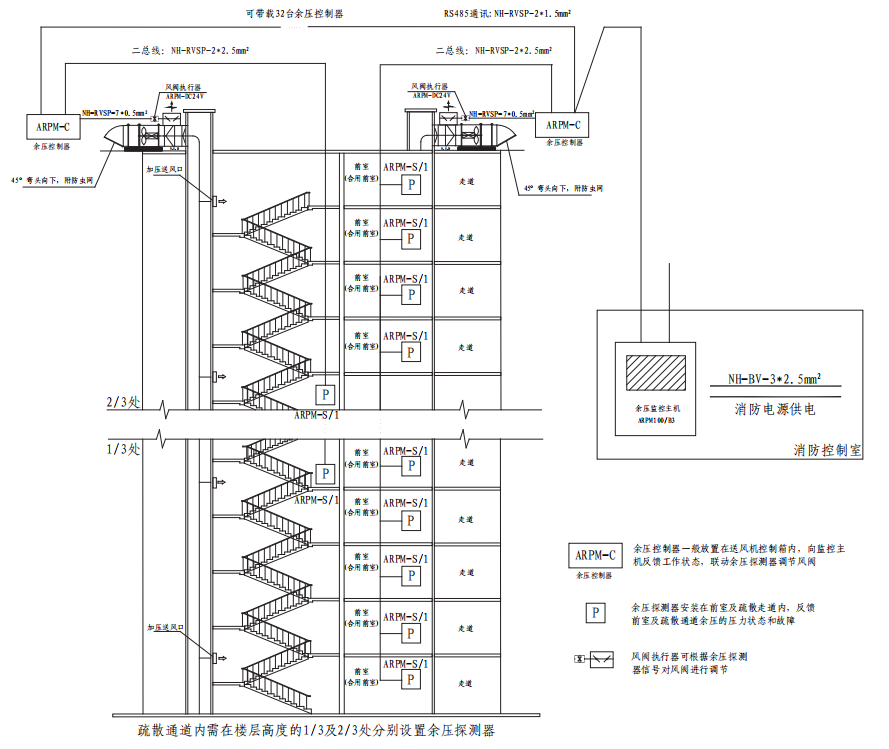 ③余壓控制器與余壓探測器之間為二總線通訊,通訊間隔500m,線型NH-RVSP-2*2.5mm2;