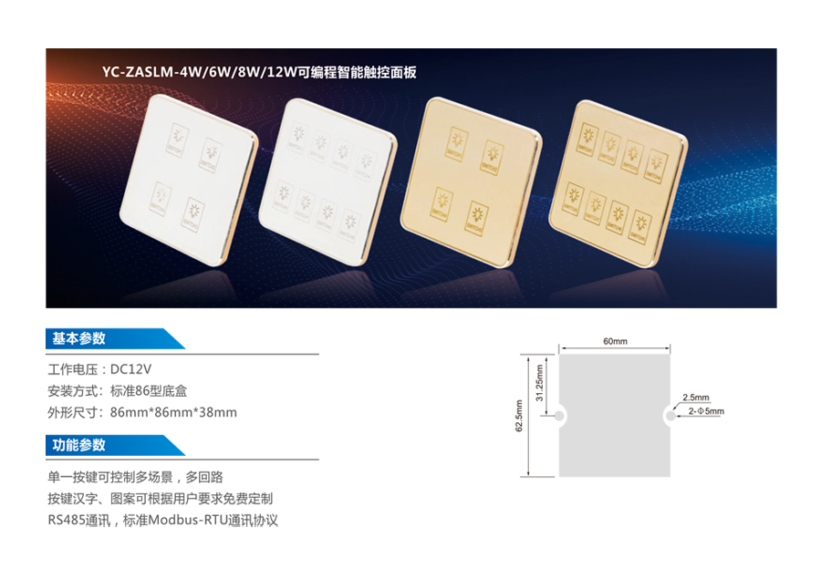 單一按鍵可控制多場(chǎng)景,多回路;按鍵漢字、圖案可根據(jù)用戶(hù)要求免費(fèi)定制;RS485通訊、標(biāo)準(zhǔn)Modbus-RTU通訊協(xié)議